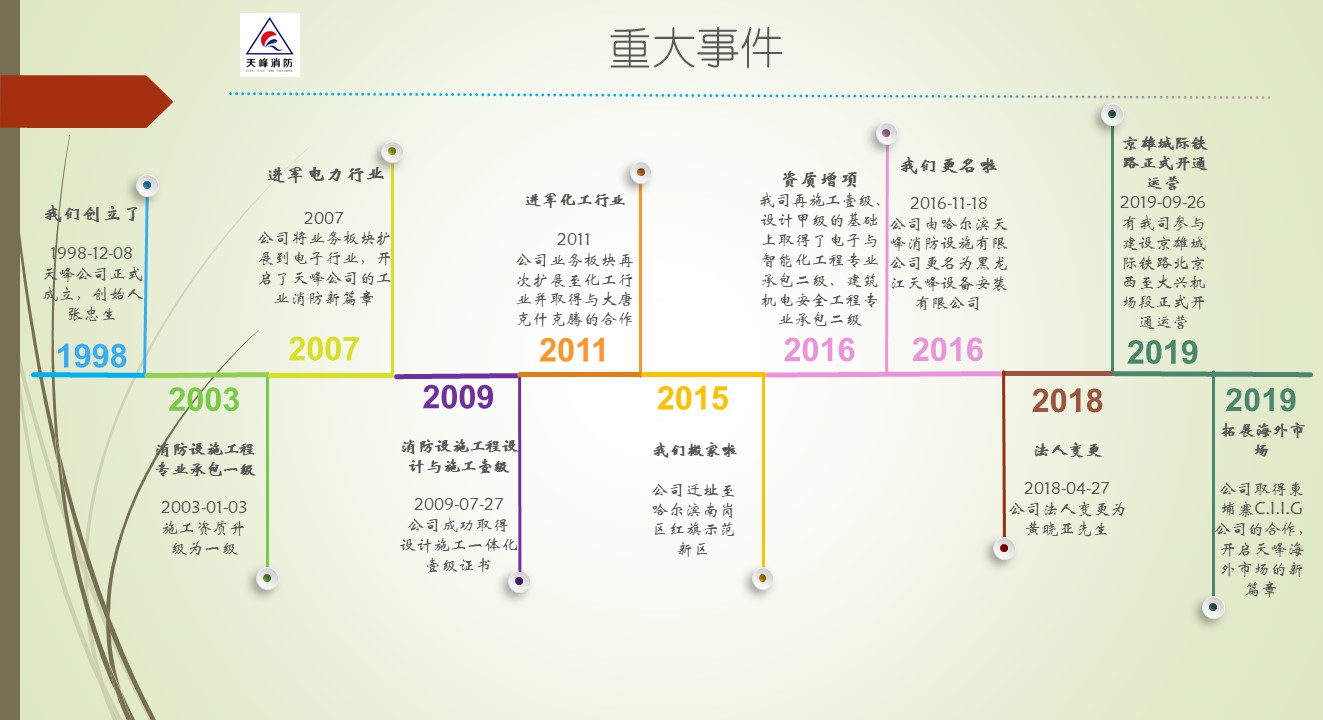 黑龍江天峰設(shè)備安裝有限公司(以下簡稱:天峰消防)創(chuàng)立于1998年,主要承接能源化工、石化、電力、軌道交通、冶金、城市管廊等工業(yè)行業(yè)消防系統(tǒng)工程,可為客戶提供特殊消防系統(tǒng)的詳細(xì)設(shè)計、供貨、施工等集成服務(wù),天峰消防將依靠自身實力和信譽實現(xiàn)“立足龍江,布局全國,走向海外”的目標(biāo)。